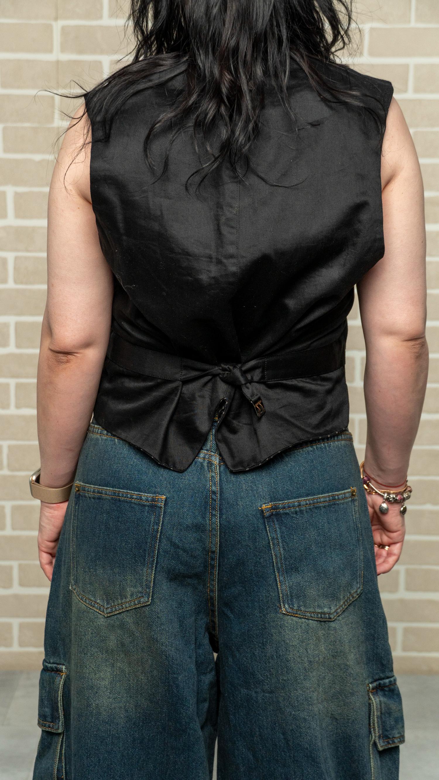 Размер: 38 Цвет: черный Материал: сукно спина – шелковая вставка Страна бренда: -Наличие дефектов: есть небольшая зацепка Особенности модели:- ОГ - 100 см Есть завязки, можно утянуть до 80 см Ширина по плечам – 35 см Длина спереди – 56 см Длина по спине – 50 см карманов:- 4