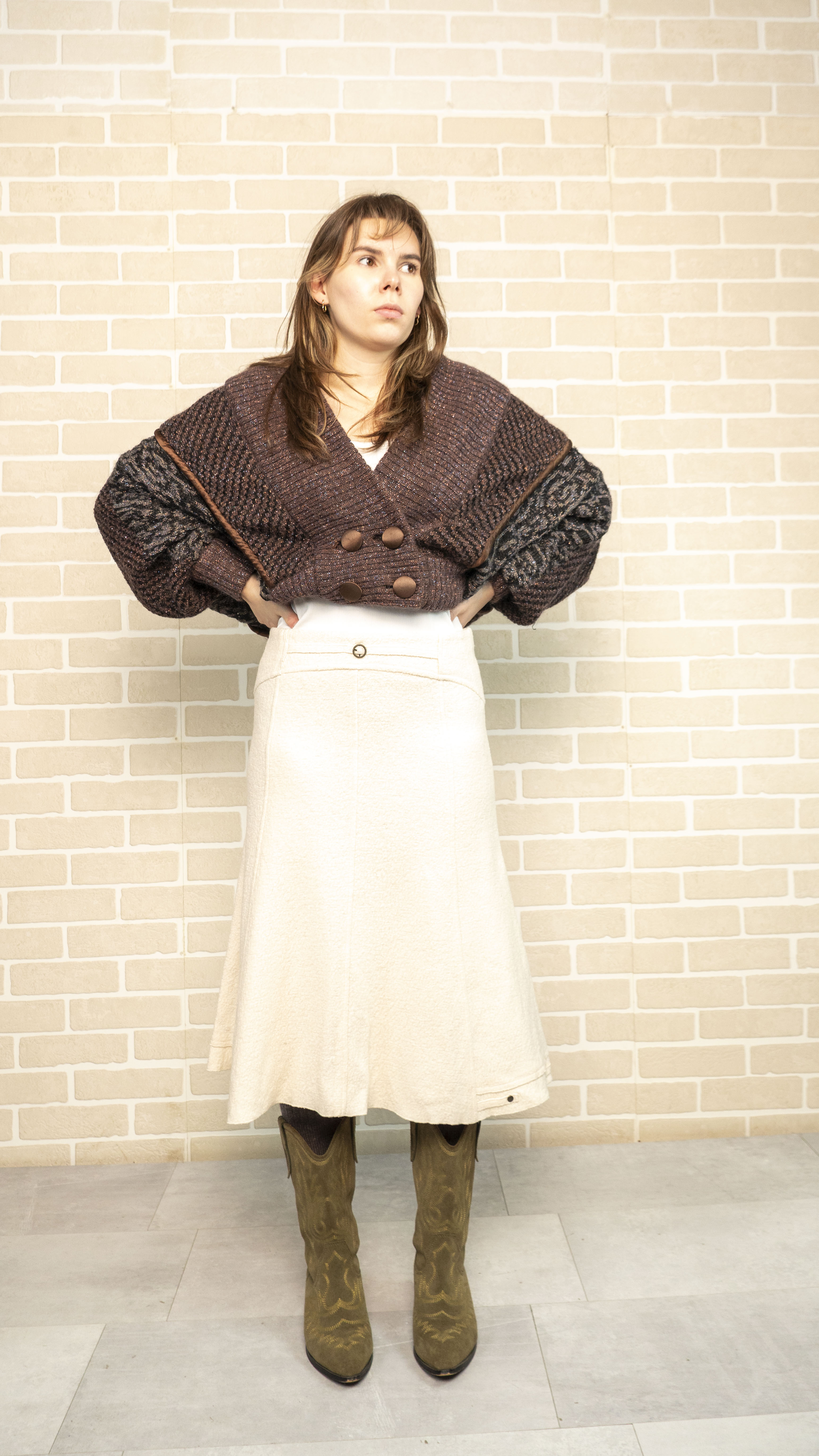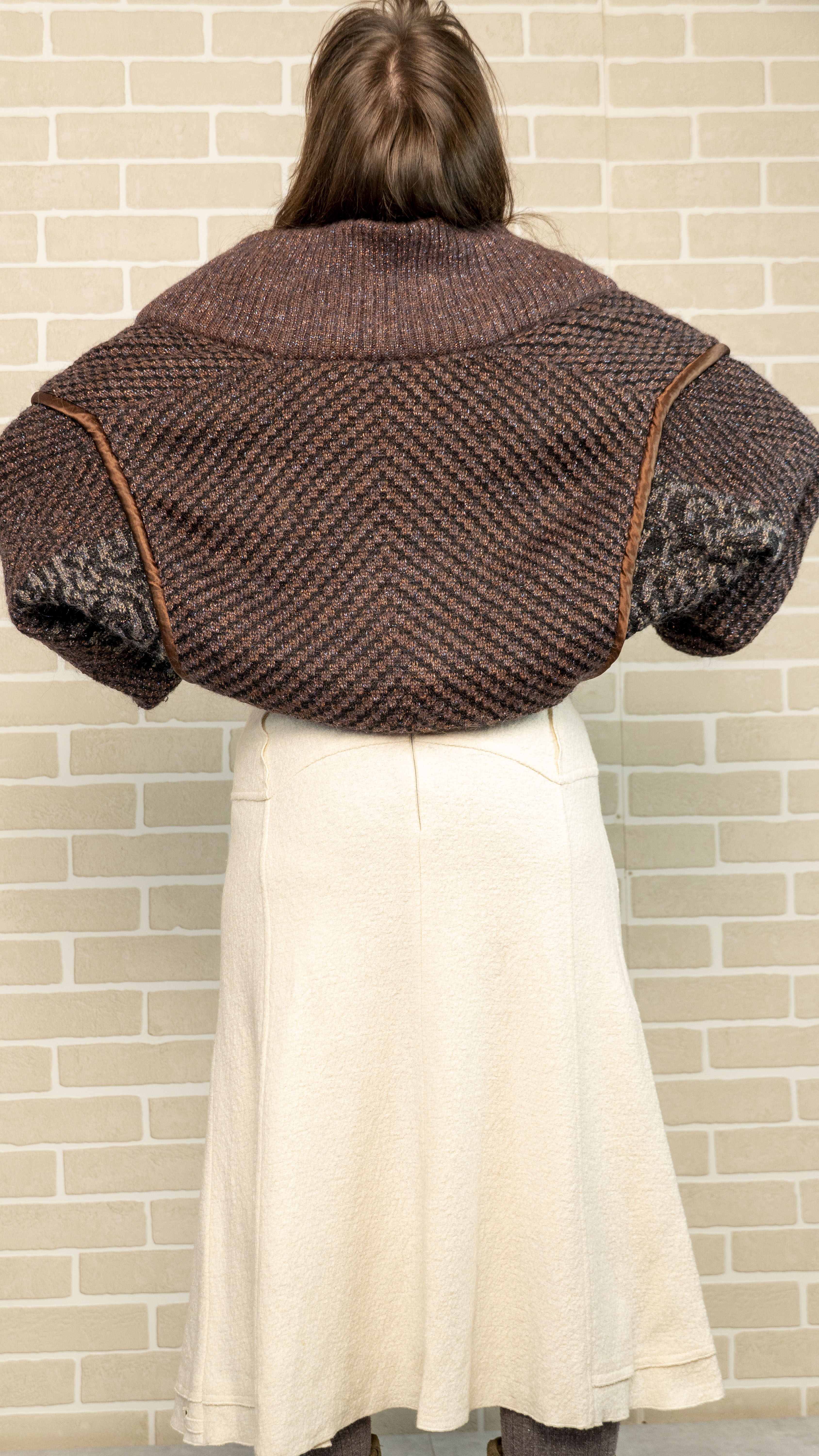 Бренд: DINOVATIANO Цвет: коричневый Материал: 37% мохер 30% - акрил 15% - металлические нити 12% - вискоза 6% - шерсть Наличие дефектов: -Особенности модели: спущенное плече Размер D-38 Замеры: ОГ - 148 см ОБ (резинка) - 90 см Плечи – 54 см Длина рукава – 54 см Длина – 55 см