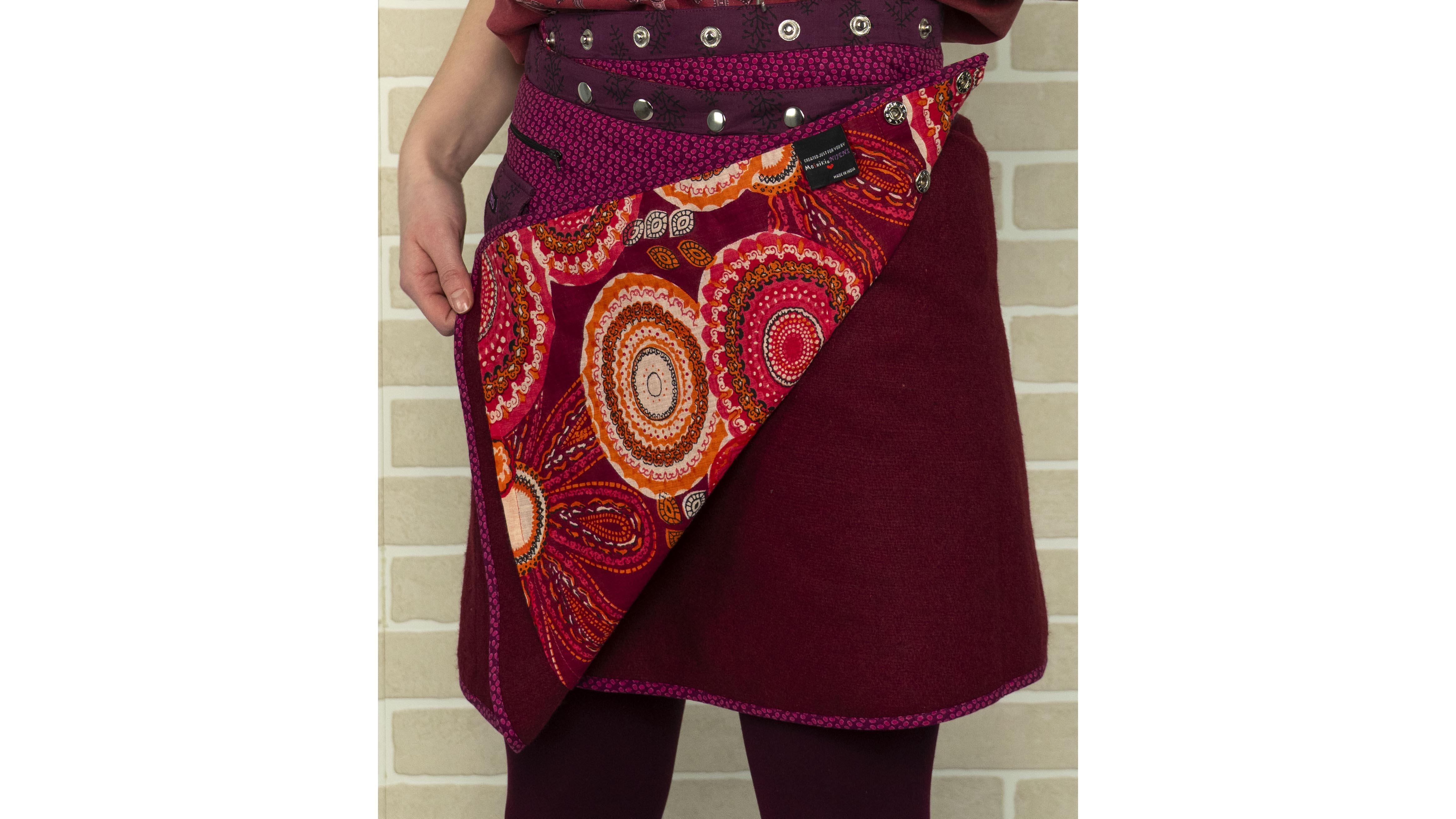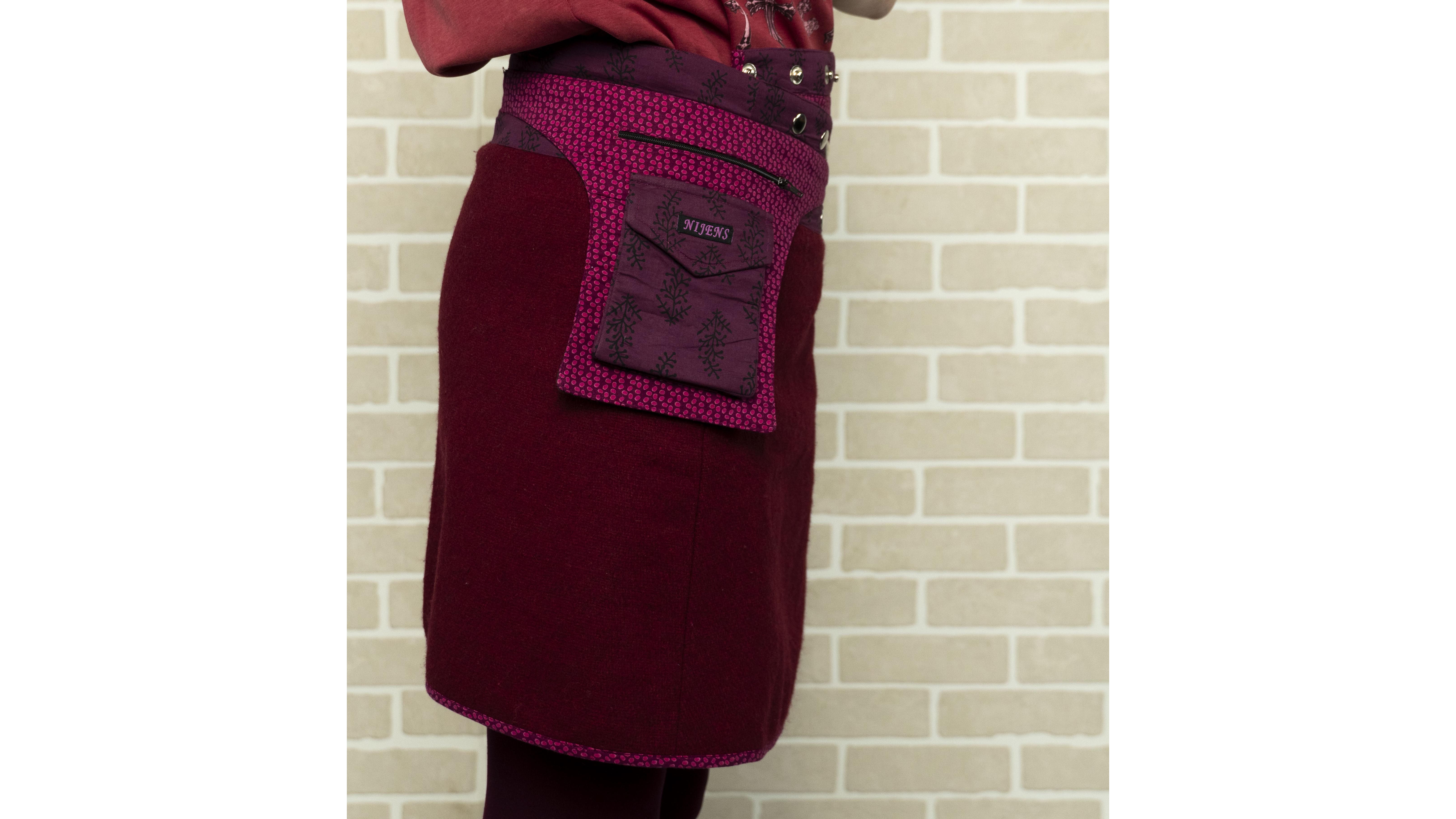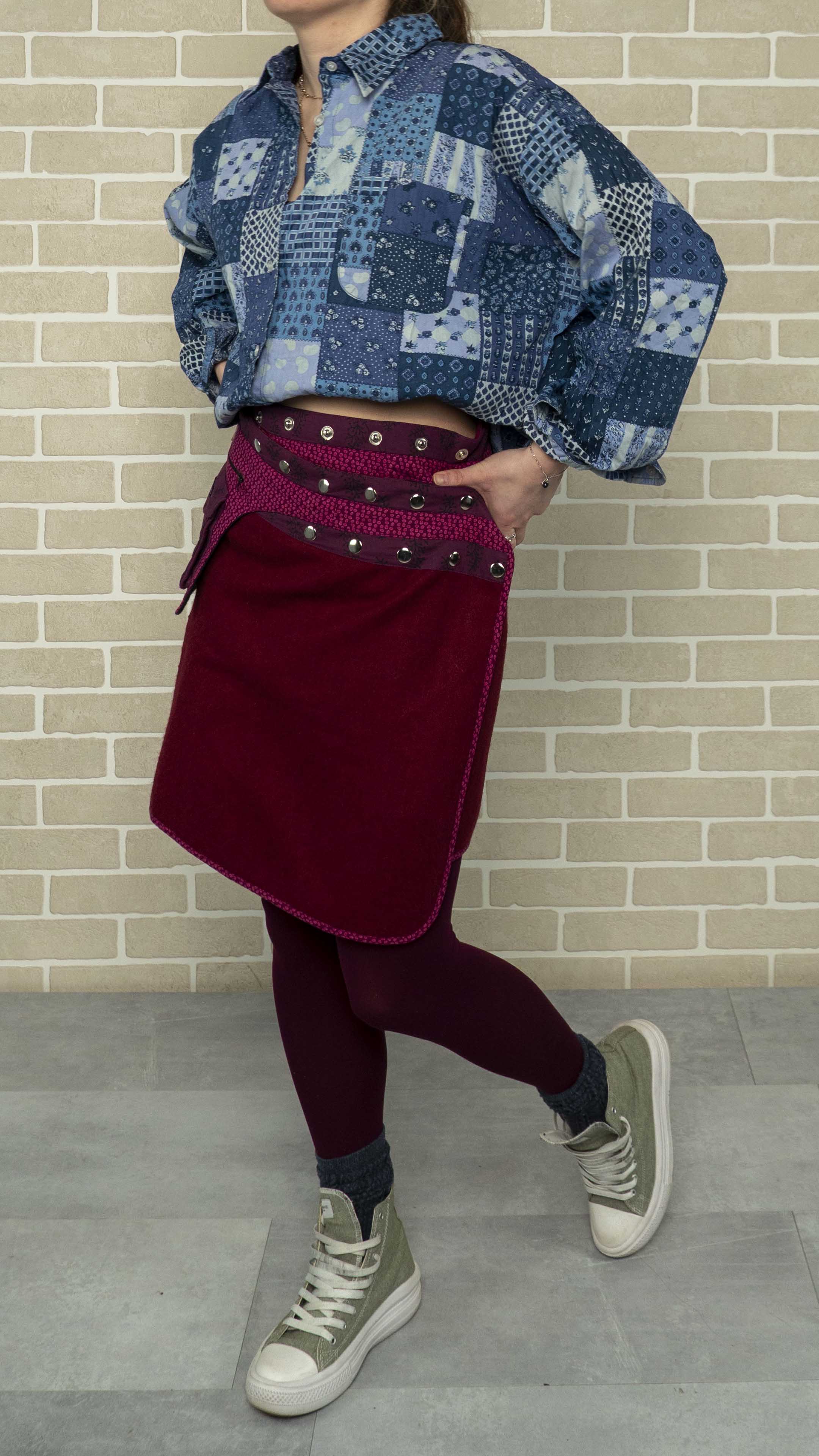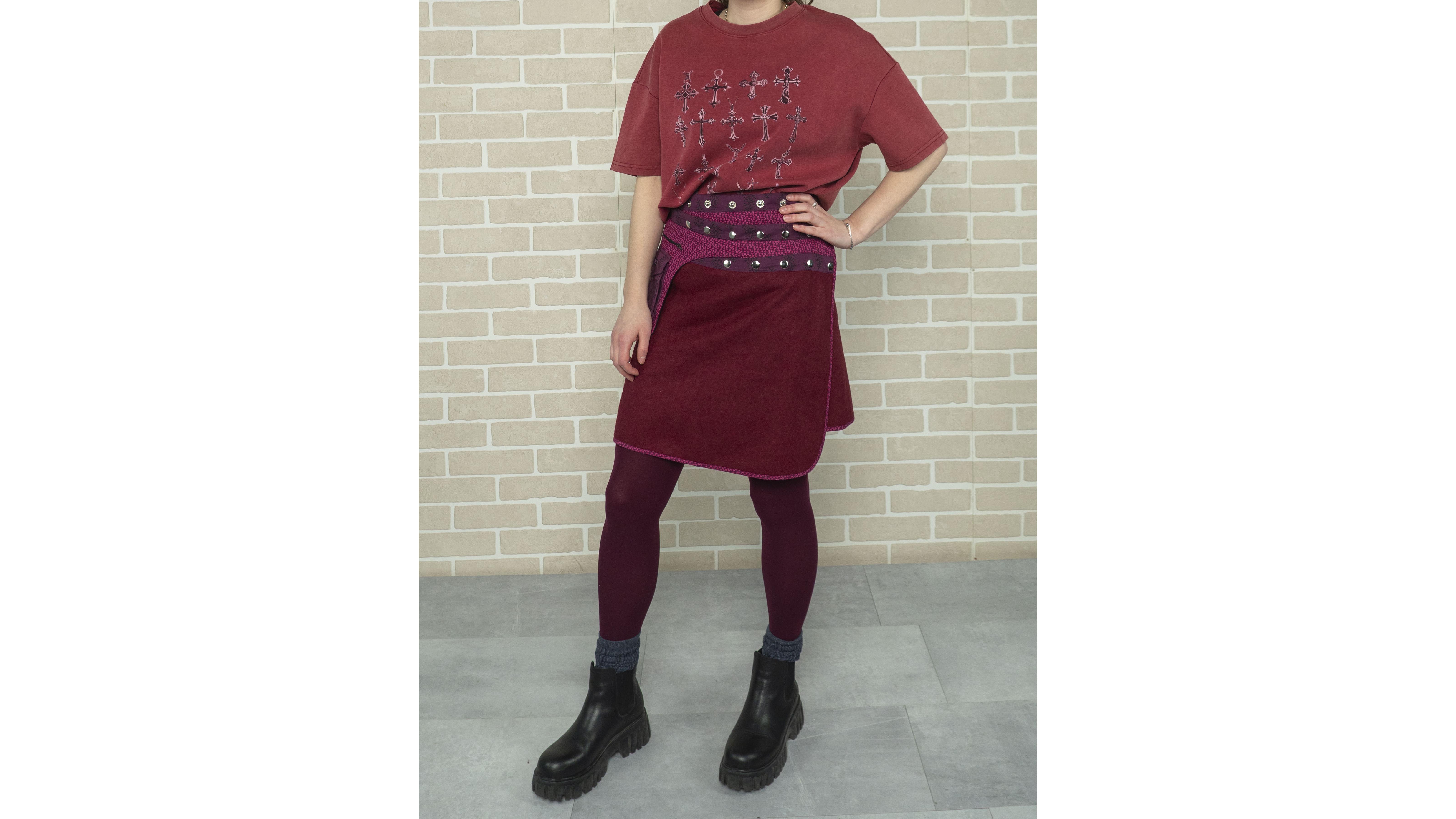 Бренд: moshiki & nijens Цвет: бордо Материал: шерсть, подкладка хлопок Страна бренда: Германия Наличие дефектов: нет Особенности модели: юбка двухсторонняя с запахам на заклепках. Можно самостоятельно регулировать размер и фасон. Внутри узорчатая подкладка, карман на боку Посадка: на бедрах Замеры: ОТ min - 72 см ОТ на все заклепки– 86 см ОТ max - 104 см ОБ- 94 см Длина от пояса – 45 см Наличие карманов:2